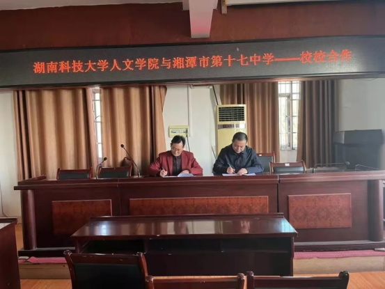 11月25日下午,湖南科技大学教育实习基地签约授牌仪式在湘潭市十七中举行。湘潭市十七中校长金光明等领导负责人、湖南科技大学华人策略网副院长聂志军教授、文学系副主任谢东老师出席了仪式。