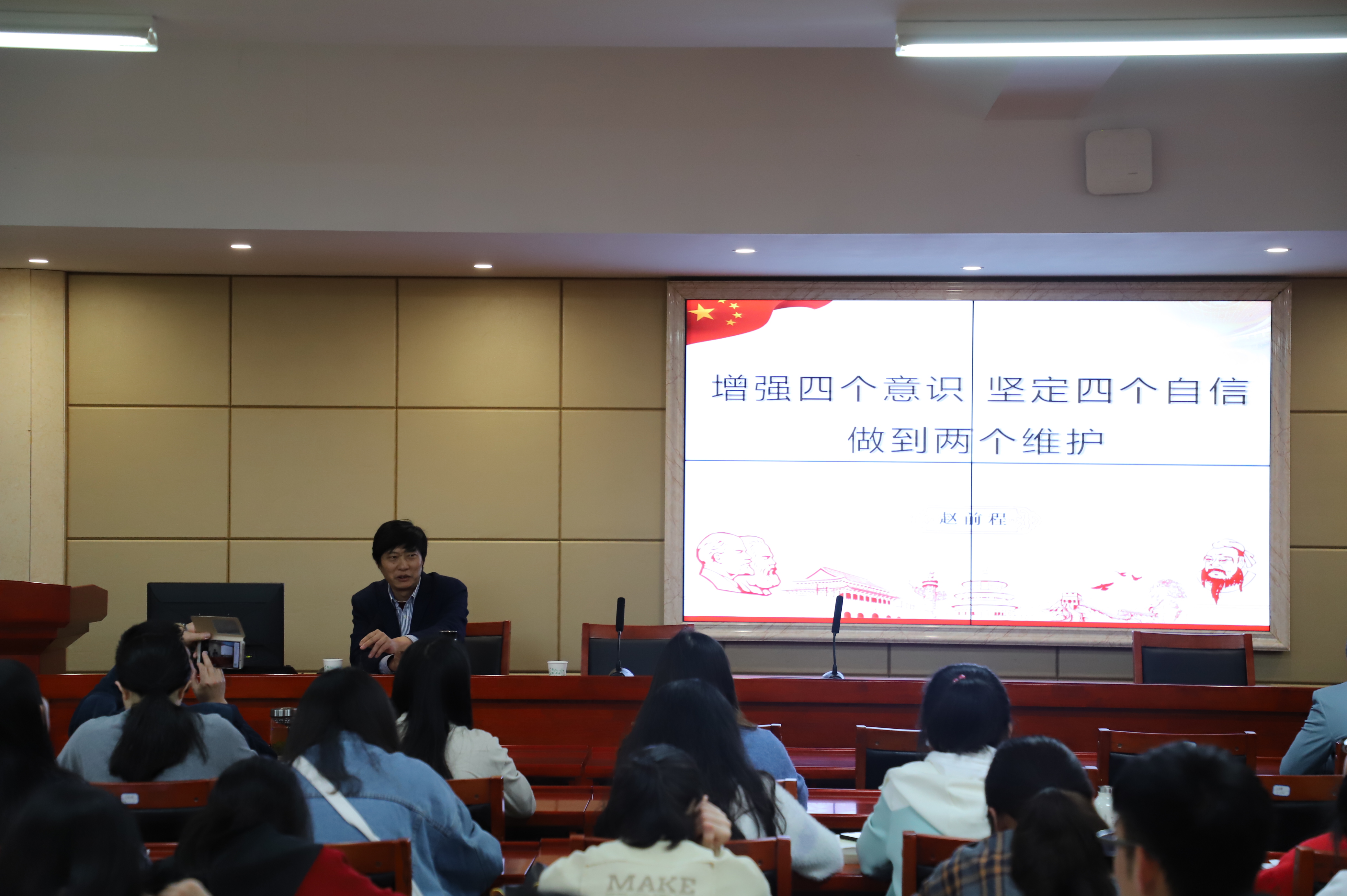 应华人策略网党委邀请,校党委委员、统战部长赵前程教授于4月16日下午在立言楼4-1报告厅为我院教工第五支部的党员老师和学生入党积极分子讲了一堂主题为“增强四个意识、坚定四个自信、做到两个维护”的精彩党课。
