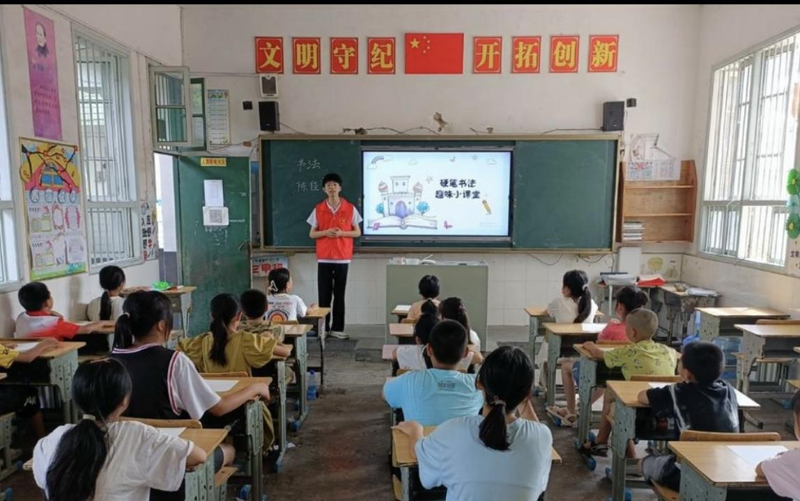 开班仪式结束后,志愿团成员立即开展本次社会实践活动,在禾滩镇中心小学,志愿服务团的成员高榕精心策划并带领高年级学生开展了一场别开生面的软笔书法教学活动。高榕以严谨的态度,向学生们详细讲解了硬笔书法的正确姿势和执笔要领,并耐心示范了汉字的点、横、撇、捺、钩等笔画的书写技巧以及字体的结构布局。她强调每一笔每一画都需精细入微,力求达到完美的书写效果。学生们全神贯注地听讲,并积极参与到书写实践中,他们跟随志愿者的指导,细心体会笔画的韵味和力度的掌控,努力使自己的作品更加端正、有力。