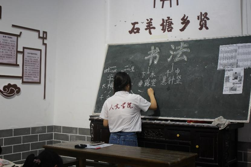 “写端端正正中国字,做堂堂正正中国人。”写字如做人,心正笔则正,书法规范要从娃娃抓起。跟随着湖南科技大学华人策略网三下乡团队志愿者们推广普通话的步伐,株洲市攸县石羊塘镇高桥村的孩子们迎来了一堂别出心裁的书法课。7月10日上午,走进三、四年级的书法课堂,团队成员陈婷正在为孩子们讲解中国书法的独特内涵,她介绍道:“中国书法被誉为‘无言的诗,无彩的画,无声的乐’,是中华民族的文化瑰宝,也是世界文明的宝贵财富。”孩子们在感悟中国文化之美的同时,就也能从内心逐渐去认可中国话、去说好普通话。