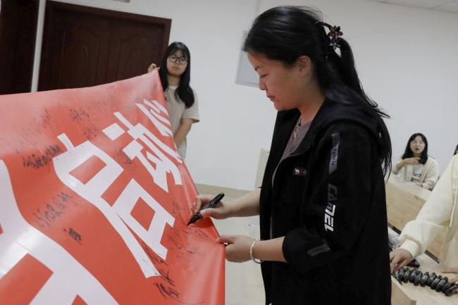 会上,老师和与会同学代表共同参与学风建设月主题签名活动,师生共同签名并承诺积极参与学风建设月活动。现场气氛热烈,掌声不断,将会议推向高潮。